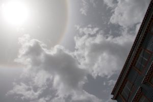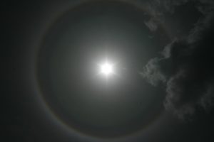“These rainbows, or rings are caused by ice crystals that form within cirrus clouds. Cirrus clouds usually appear at very high altitudes, usually above 8000 meters or 26,000 ft. These clouds tend to be very thin, due to the lack of abundant moisture at those altitudes. This type of halo is also called a 22° halo, with the ring around the sun appearing usually 44 times larger the sun. The crystals that form in the clouds are hexagonal in shape, which act as prisms for the sun’s light.” (http://www.new-technology-