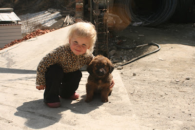 We went away the week after Christmas, and when we came back, we found that the guard dog at the hostel had given birth to puppies! We didn’t even really know she was pregnant, although right before we left, Kris suspected something was up with the dog… Kris said he didn’t want to ask the landlord for one of the puppies until he had time to see if they were cute or not. But now, when we got back after our vacation, the landlord had given all the puppies away but one. Maybe someday we’ll get a nice dog out here. We have to admit, though, that the remaining puppy is pretty cute, and super friendly and playful with Adalia! Nearly every day now, Adalia can’t wait to play with the “Baby Guo Guo (Chinese for dog)”.